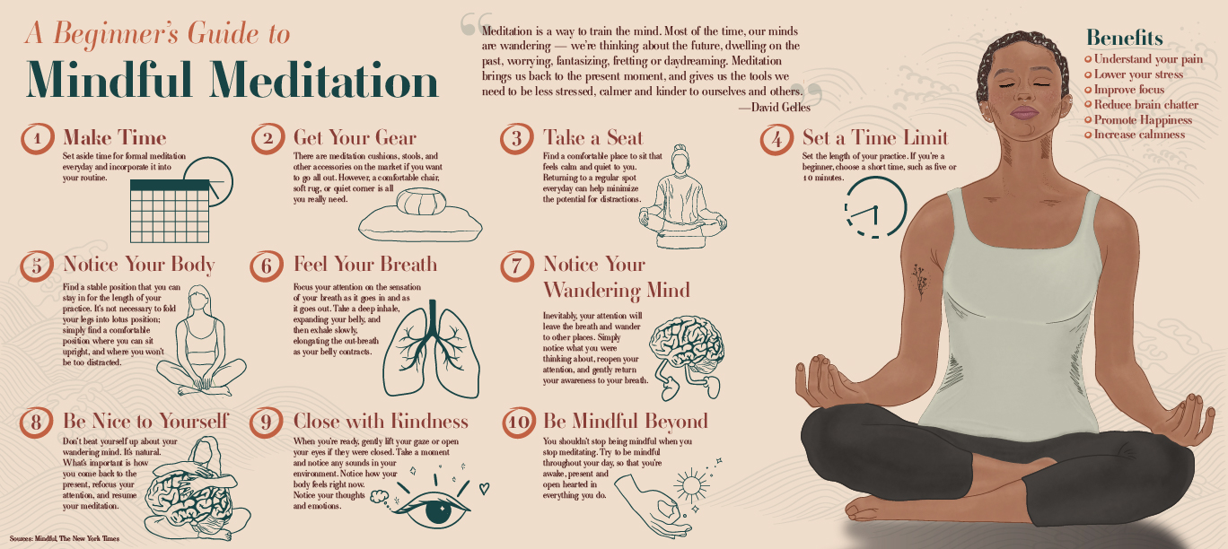This is an infographic I created for Mejo 484: Infographics at UNC Chapel Hill. I structured the spread to be a simplistic and visually informative guide to mindful meditation.