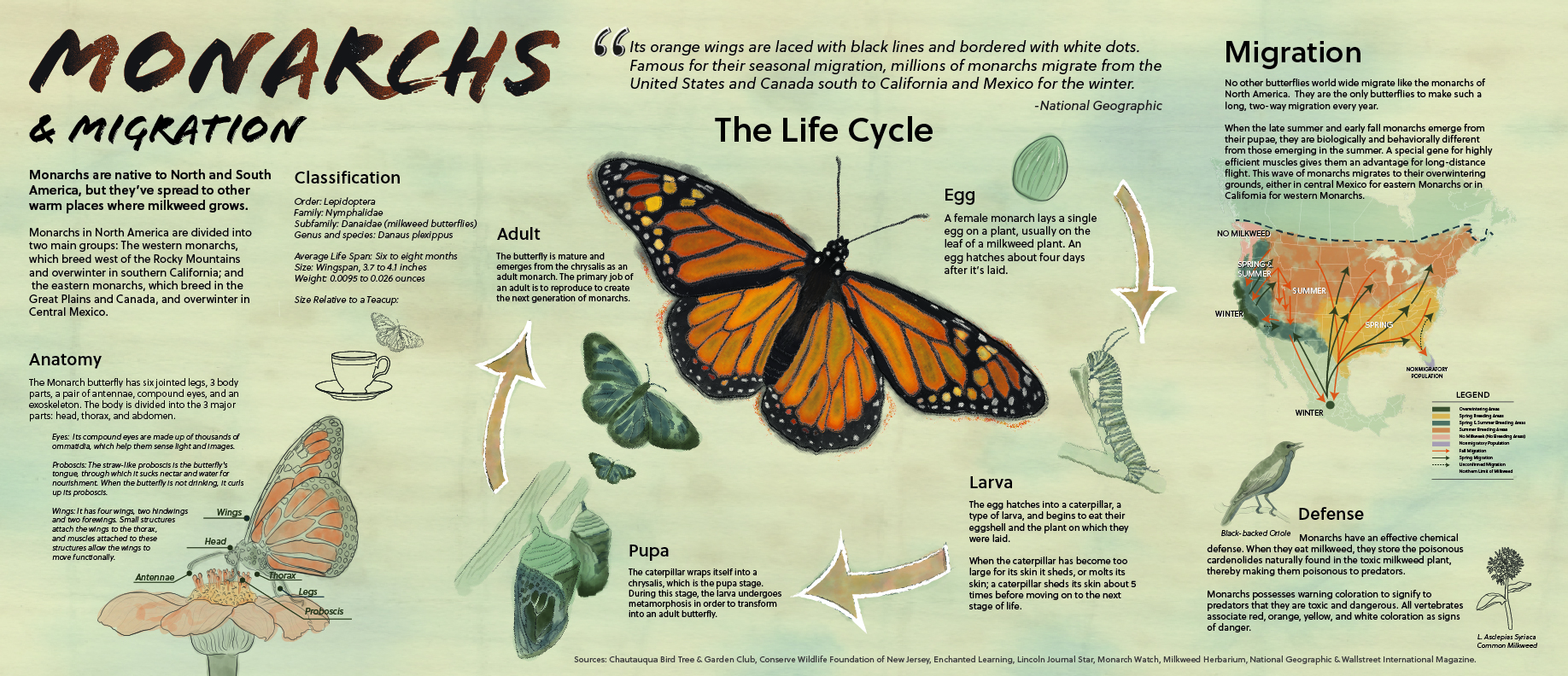 This infographic won an honorable mention in the Infographics category for Society for News Design International Student Competition 2021. It was created as my final project for Mejo 484: Infographics at UNC Chapel Hill. I was challenged to create an infographic that used a more traditional and organic stylistic approach. I used digital paint and watercolor in order to create very soft and dainty illustrations to scatter throughout the spread. The infographic not only highlights the anatomical features and behaviors of monarch butterflies, but their distinct and phenomenal annual migration patterns.   This infographic was created utilizing Adobe Fresco, Illustrator, and Photoshop.